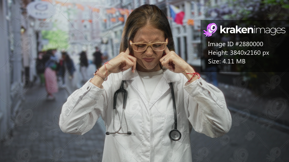 Young hispanic woman doctor in white coat with stethoscope covering ears with fingers while grimacing on a busy city street; annoyance.