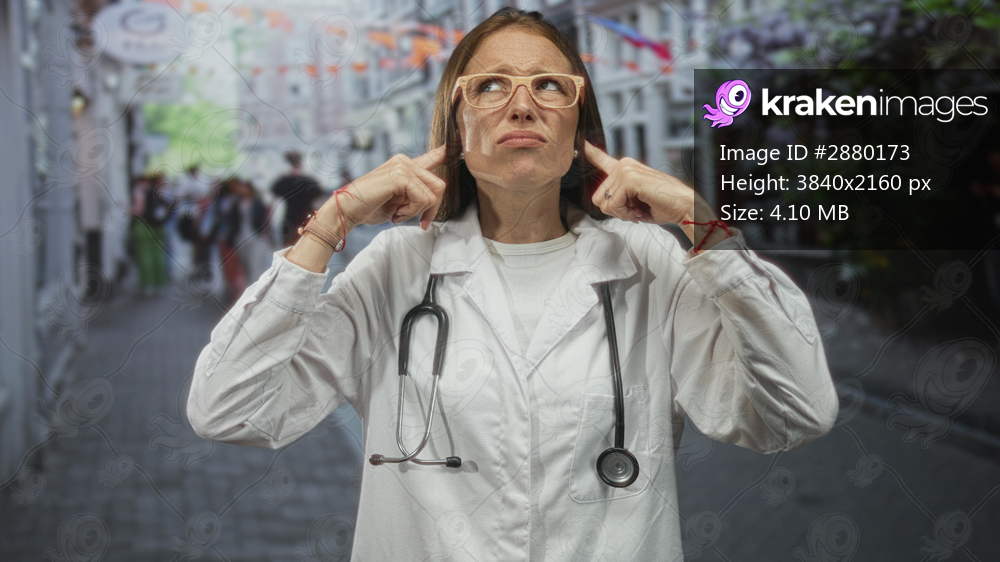 Young hispanic woman doctor in white coat with stethoscope covering ears with fingers while grimacing on a busy city street; annoyance.