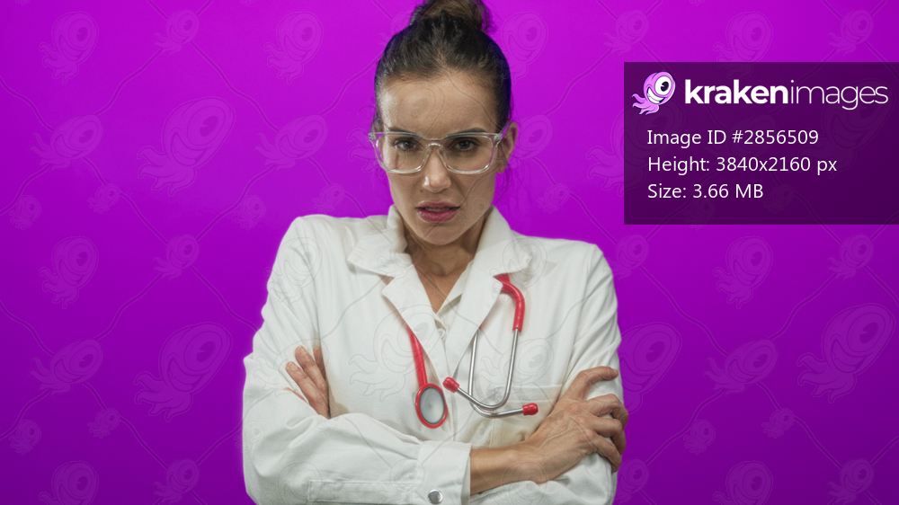 Young hispanic woman doctor in white coat with stethoscope and glasses, arms crossed in studio with purple wall; disapproval anger.