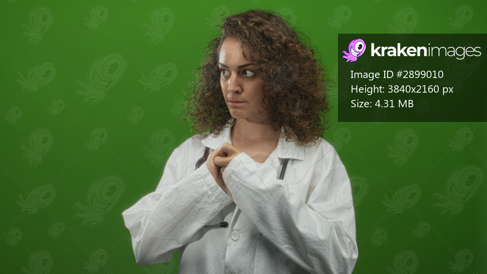 Young hispanic woman doctor in white lab coat with stethoscope, interlocking fingers near chest in green studio; concern uncertainty.