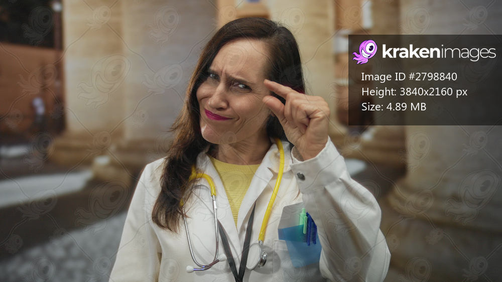 Young hispanic woman doctor pinches thumb and index finger for small size gesture on old town street; precision detail focus.