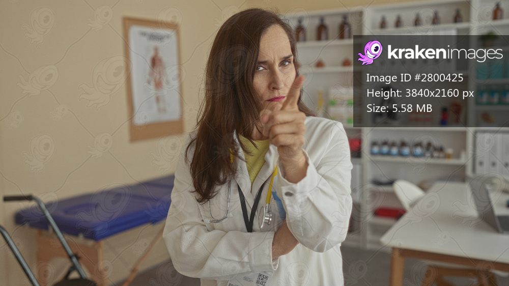 Young hispanic woman doctor pointing finger in clinic room; scolding warning authority anger.