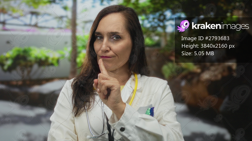 Young hispanic woman doctor points index finger in garden; warning authority discipline.