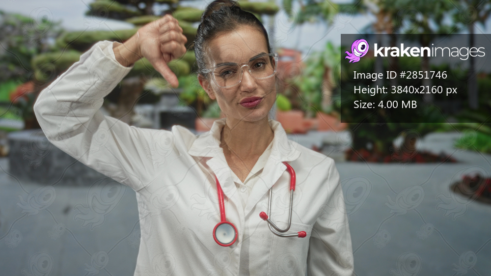 Young hispanic woman doctor with red stethoscope gives double thumbs down gesture on street; rejection protest.