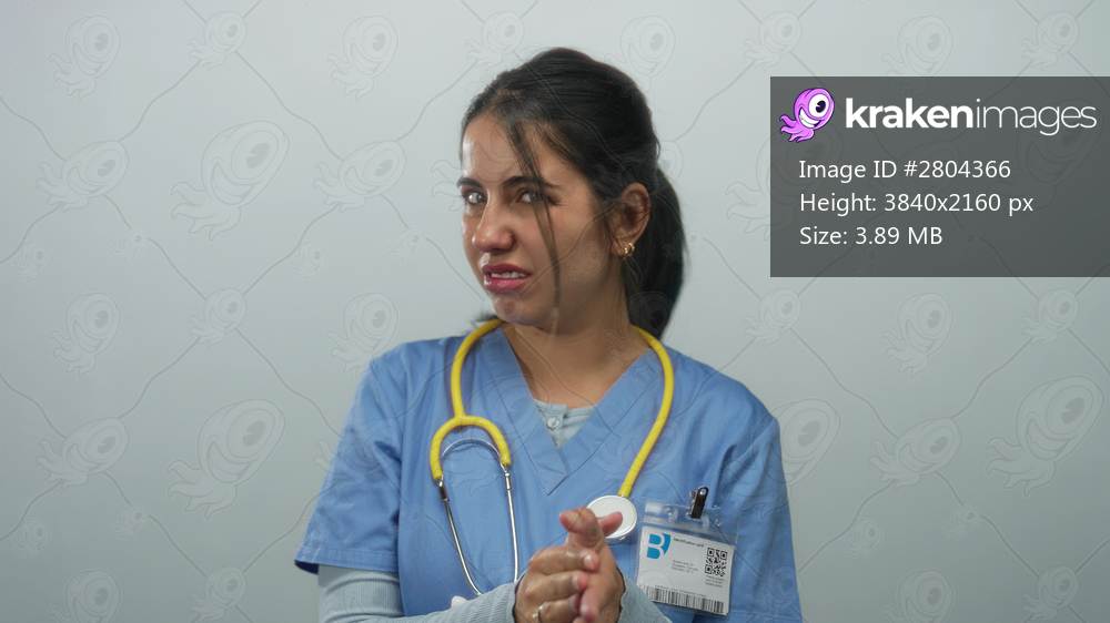 Young hispanic woman doctor with stethoscope claps hands in studio with white wall; disgust disapproval.