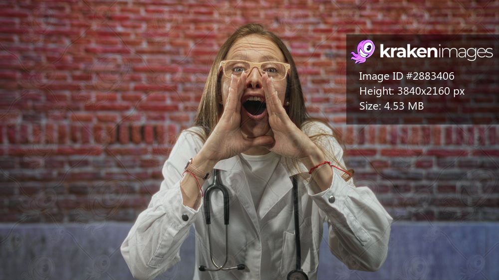 Young hispanic woman doctor with stethoscope cups hands around mouth in a brick building; urgency duty.