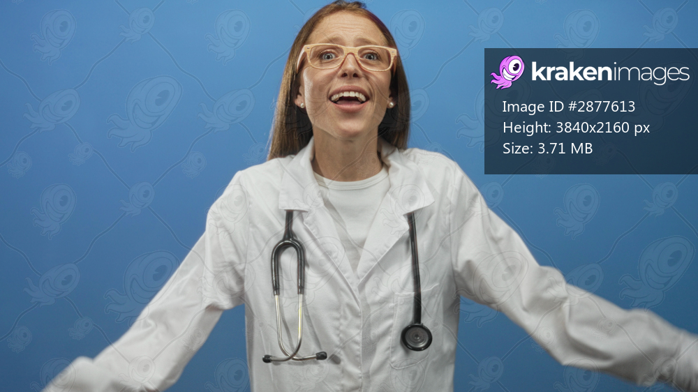 Young hispanic woman doctor with stethoscope cups hands around mouth in blue studio; urgent public health message.