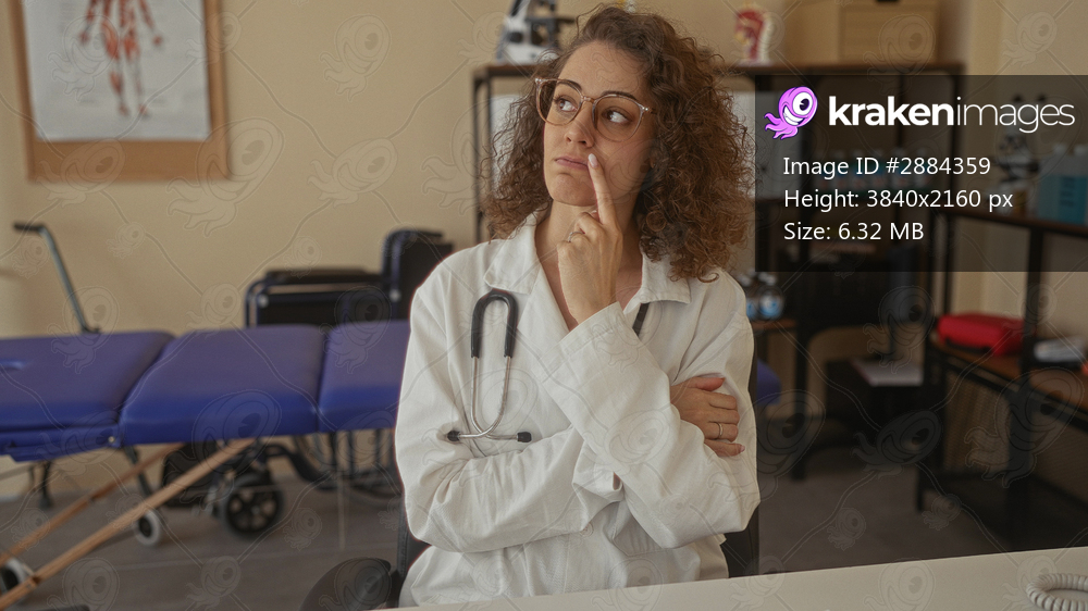 Young hispanic woman doctor with stethoscope finger to lips for silence in clinic consultation room; pensive.