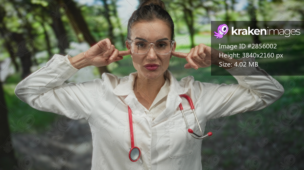 Young hispanic woman doctor with stethoscope grimacing while plugging ears with fingers in forest; frustration.