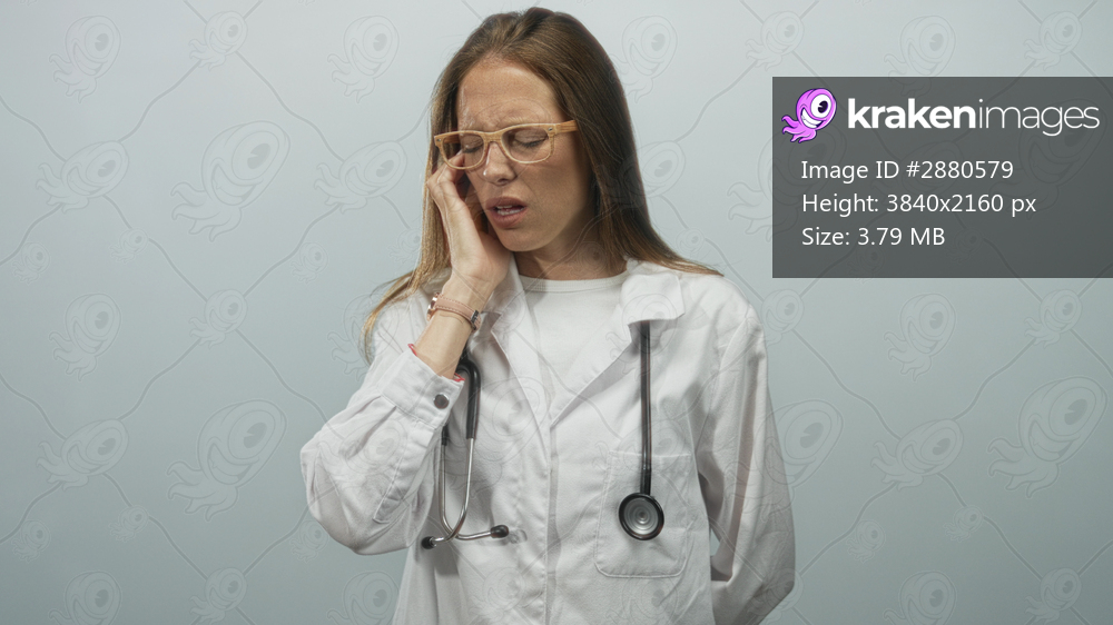 Young hispanic woman doctor with stethoscope holding cheek and wincing in pale blue studio; toothache pain.