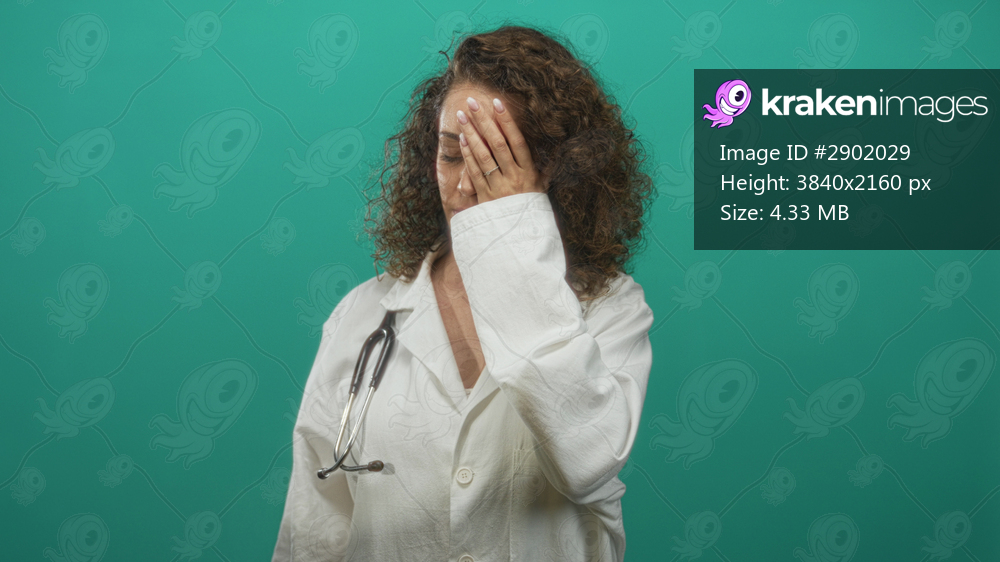 Young hispanic woman doctor with stethoscope holding hand to face in teal studio; stress recovery fatigue.
