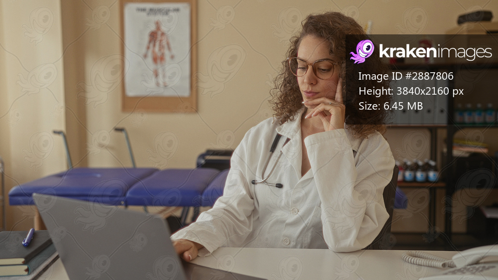 Young hispanic woman doctor with stethoscope typing on laptop at desk wearing glasses in building; professional calm concentration.