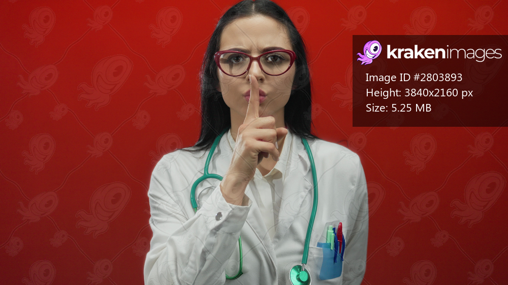 Young hispanic woman doctor wearing a stethoscope and glasses makes a silence gesture in front of a vibrant red wall background, emphasizing the importance of quiet and confidentiality. - Kraken Images