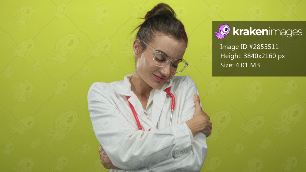 Young hispanic woman doctor wearing glasses and white coat with red stethoscope hugs her arm with closed eyes in a studio; comfort.