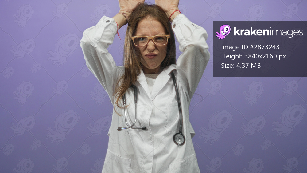 Young hispanic woman doctor wearing white coat and glasses with stethoscope and hands on head in purple studio; frustration.