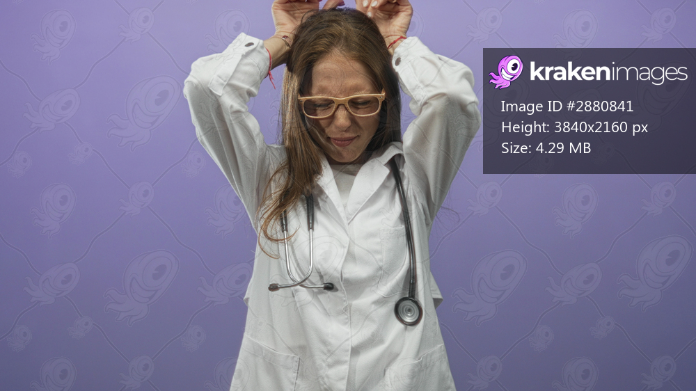 Young hispanic woman doctor wearing white coat and glasses with stethoscope and hands on head in purple studio; frustration.