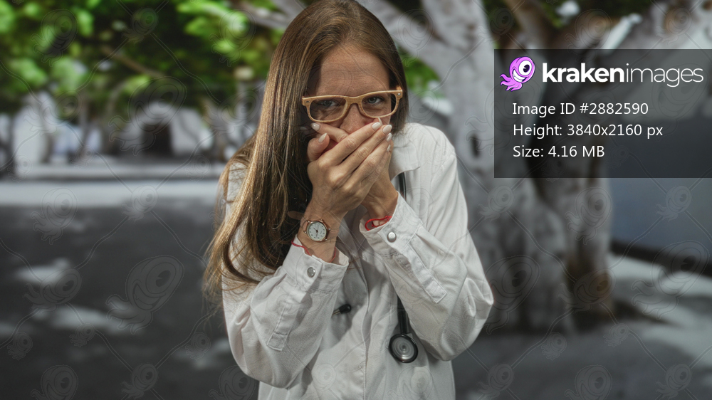 Young hispanic woman doctor wearing white coat and stethoscope covers mouth with hands in a forest; surprise.