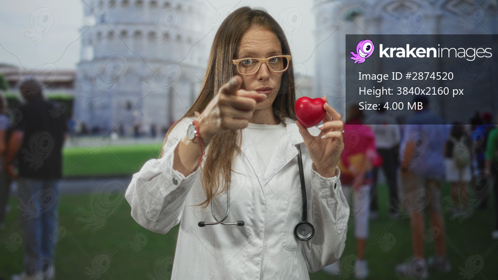Young hispanic woman doctor wearing white coat with stethoscope points finger to temple while holding red heart near chest in front of pisa tower building on lawn; thoughtful heart health awareness. - Kraken Images