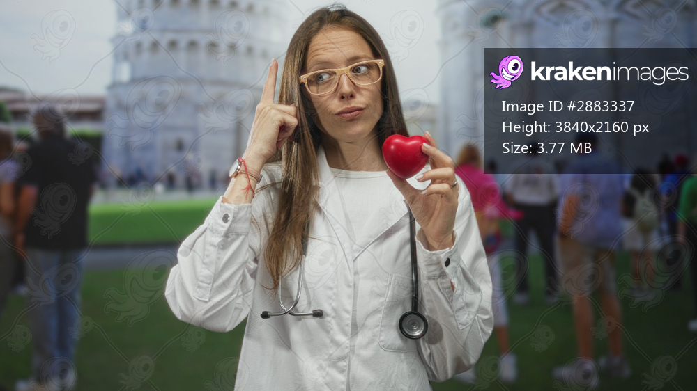 Young hispanic woman doctor wearing white coat with stethoscope points finger to temple while holding red heart near chest in front of pisa tower building on lawn; thoughtful heart health awareness. - Kraken Images