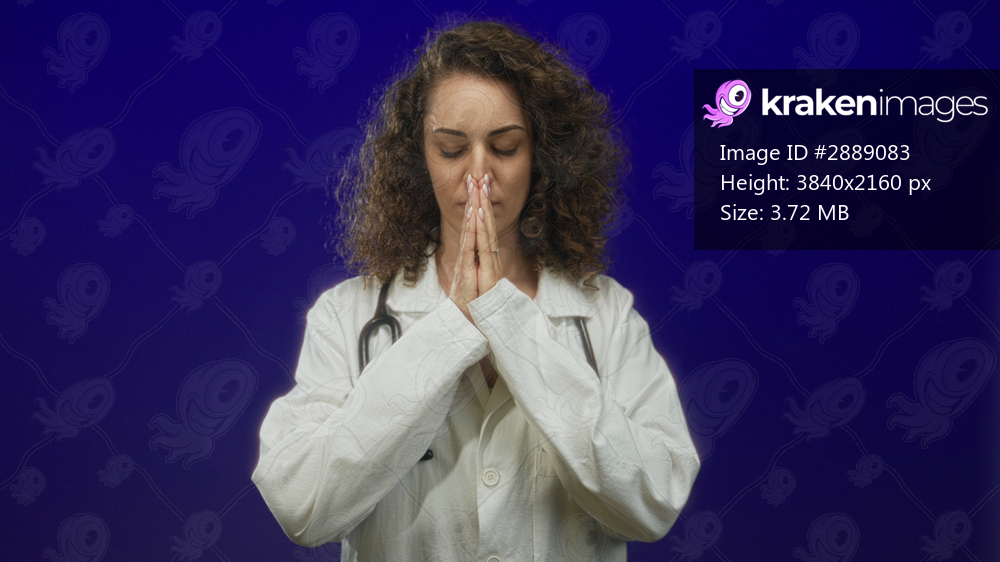Young hispanic woman doctor wearing white coat and stethoscope, pressing hands together with closed eyes in blue studio setting; calm compassion.