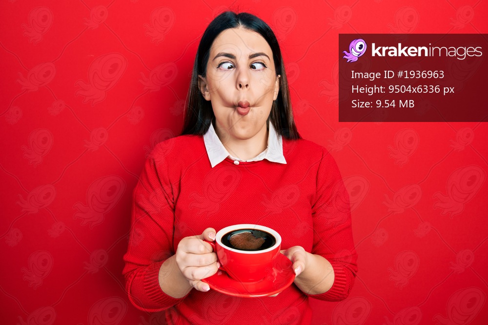 Young hispanic woman drinking a cup of coffee making fish face with mouth and squinting eyes, crazy and comical.