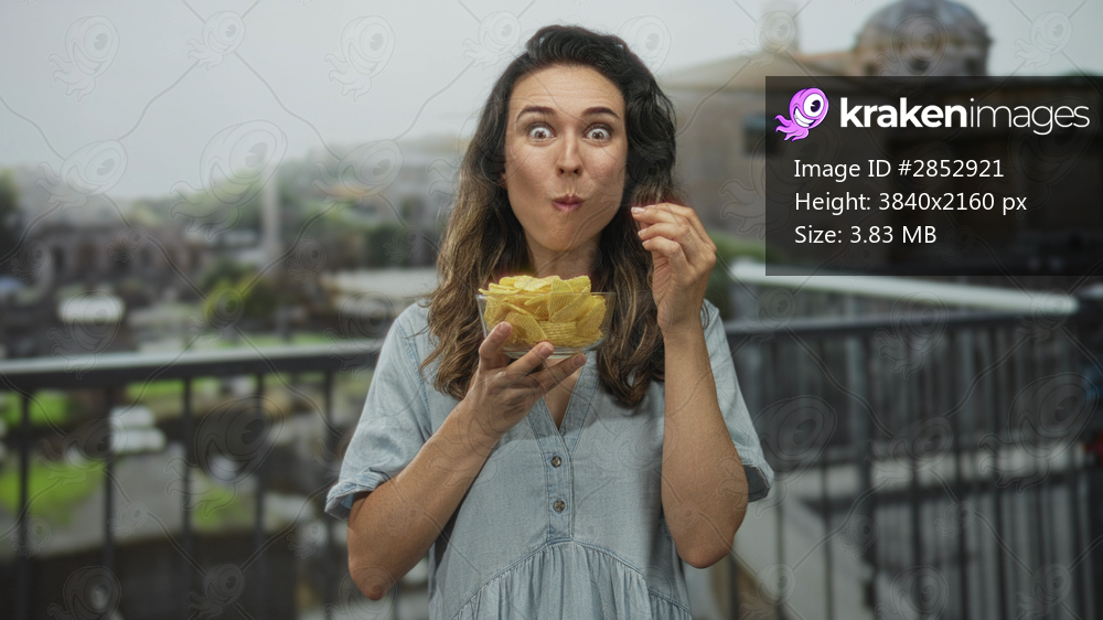 Young hispanic woman eating chips from a glass bowl in front of sunlit stone building; casual enjoyment.