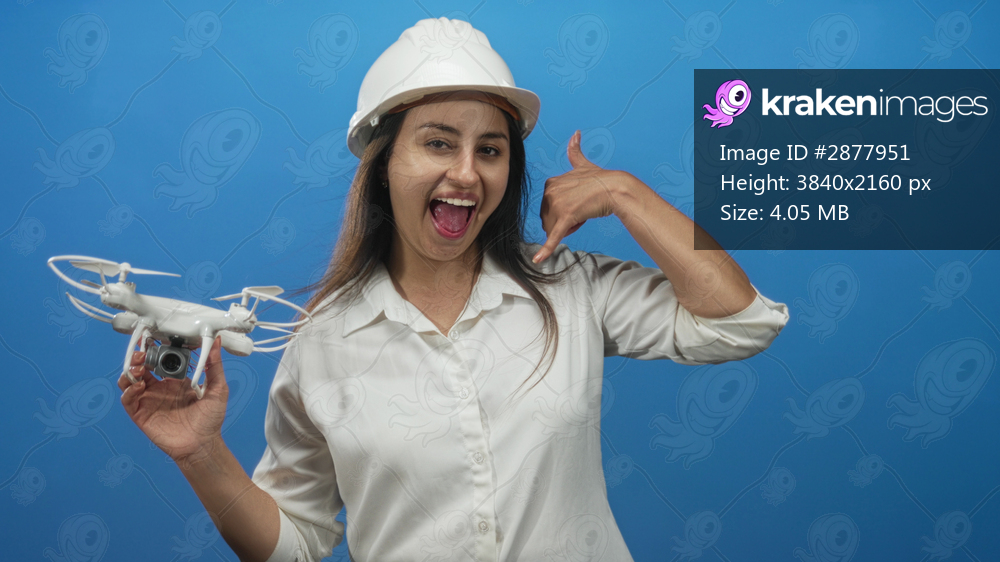 Young hispanic woman engineer wearing a hardhat holding a drone and making a call me hand gesture in studio; confidence innovation.