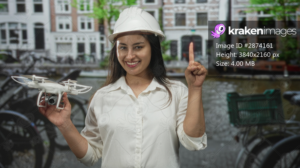 Young hispanic woman engineer wearing hardhat holding drone with one hand and points finger up on street beside a canal building in amsterdam; confidence innovation technology. - Kraken Images