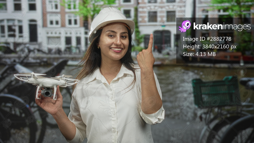 Young hispanic woman engineer wearing hardhat holding drone with one hand and points finger up on street beside a canal building in amsterdam; confidence innovation technology. - Kraken Images