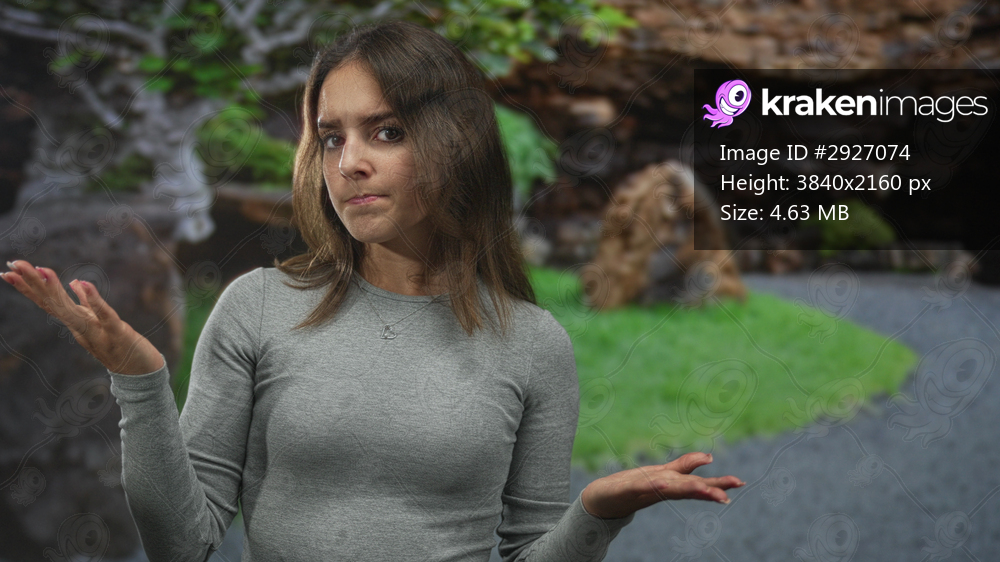 Young hispanic woman examining outstretched hand in forest near a rocky arch, wearing gray long sleeve top and heart pendant; concern.