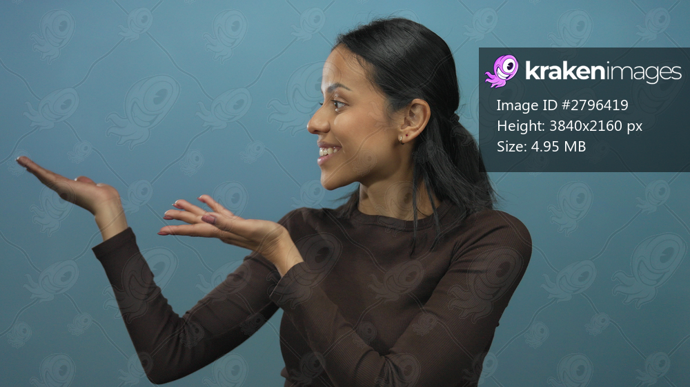 Young hispanic woman excitedly presenting against an isolated blue wall, showcasing enthusiasm with open hands and joyous expression.
