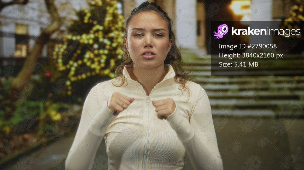Young hispanic woman exercising outdoors with blurred lights and steps in the background showcasing focus and determination in a serene setting.