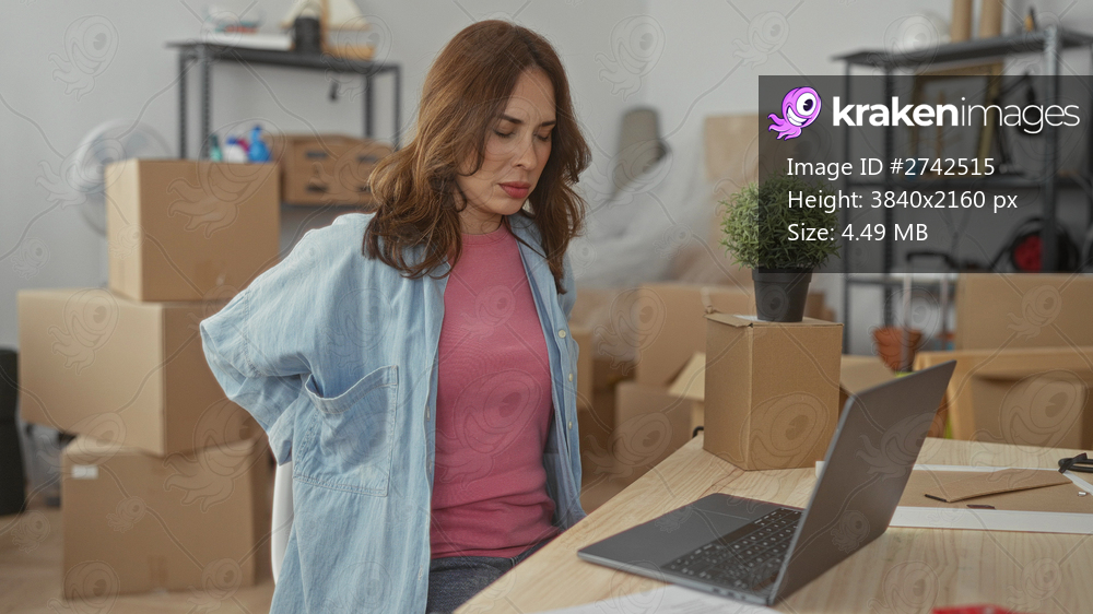 Young hispanic woman experiencing back pain while unpacking boxes in new home living room surrounded by cardboard laptop and plant on the desk.