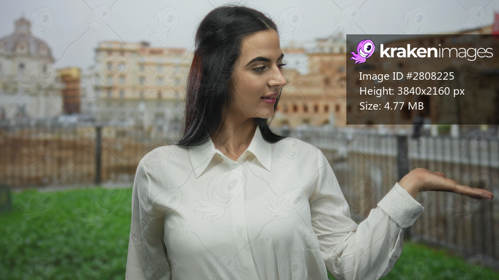 Young hispanic woman exploring roman ruins in the background, standing outdoors on a street, wearing a white shirt, smiling confidently in a historical and cultural setting. - Kraken Images