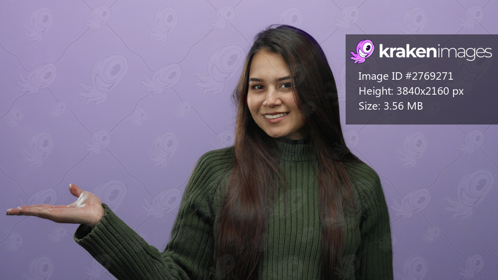 Young hispanic woman extending hand wearing green sweater against solid purple background