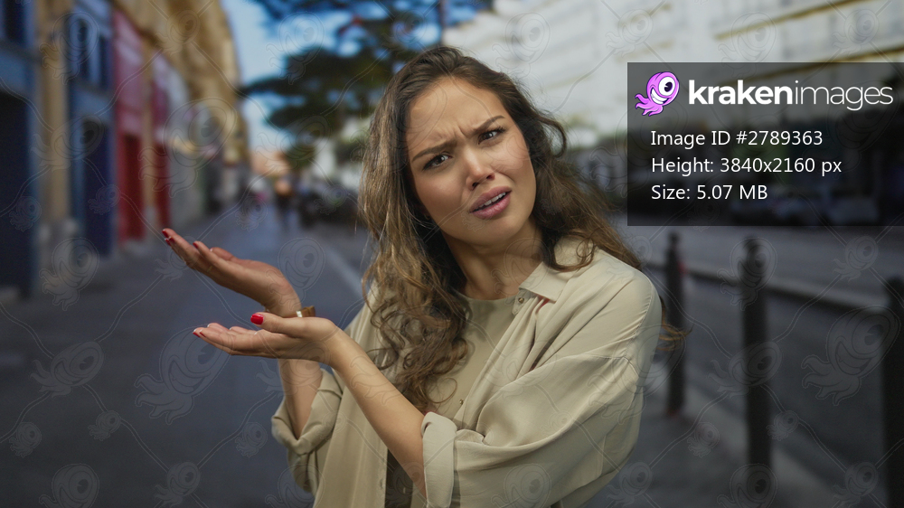 Young hispanic woman extends bare hands in a questioning gesture on a busy urban street lined with buildings; confusion.