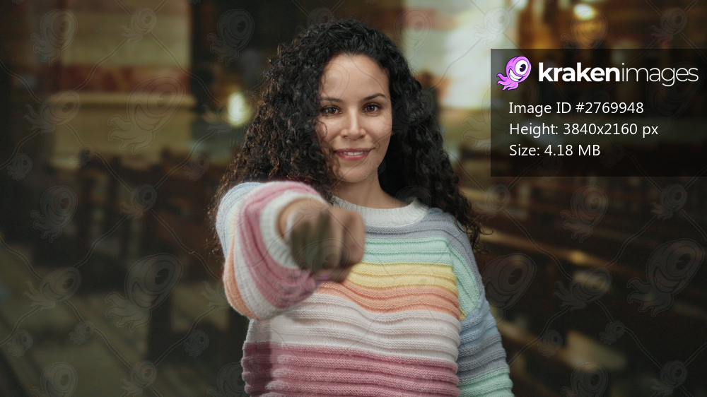 Young hispanic woman extends fist towards camera in indoor church setting, showcasing vibrant sweater and curly hair in a serene spiritual environment. - Kraken Images