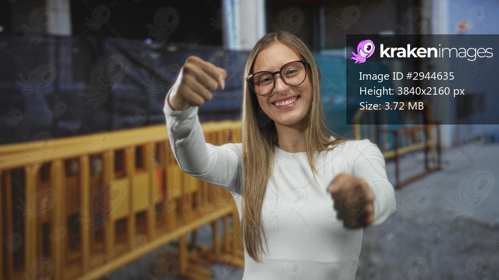 Young hispanic woman extends fists toward camera wearing glasses inside an industrial building with yellow barricade and concrete floor; playful energy. - Kraken Images