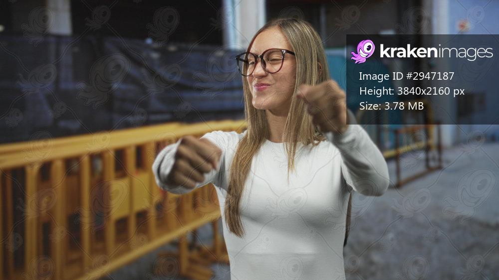 Young hispanic woman extends fists toward camera wearing glasses inside an industrial building with yellow barricade and concrete floor; playful energy. - Kraken Images