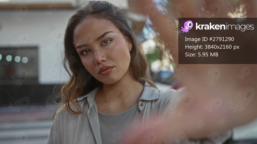 Young hispanic woman extends hand forward in stop gesture on busy street; personal boundary defiance.
