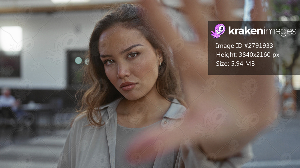 Young hispanic woman extends hand forward in stop gesture on busy street; personal boundary defiance.