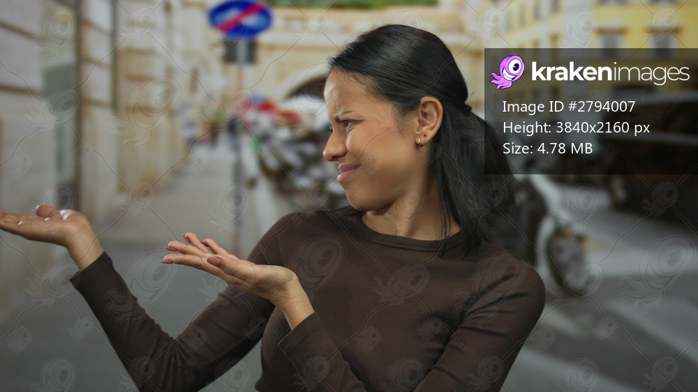 Young hispanic woman extends hands on a bustling city street outdoors showing mixed emotions with urban background visible.