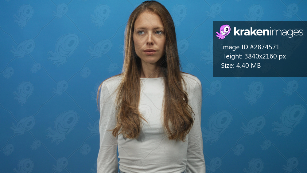 Young hispanic woman with eyes closed, arms raised and long hair visible in studio against solid blue backdrop wearing white top; calm reflection.