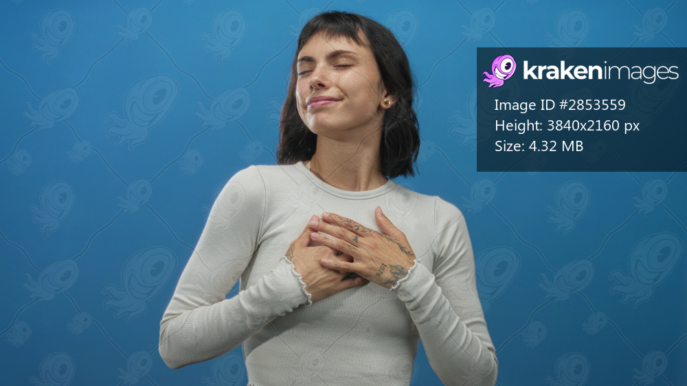 Young hispanic woman with eyes closed holds hands to chest with subtle smile in blue studio; serenity gratitude.
