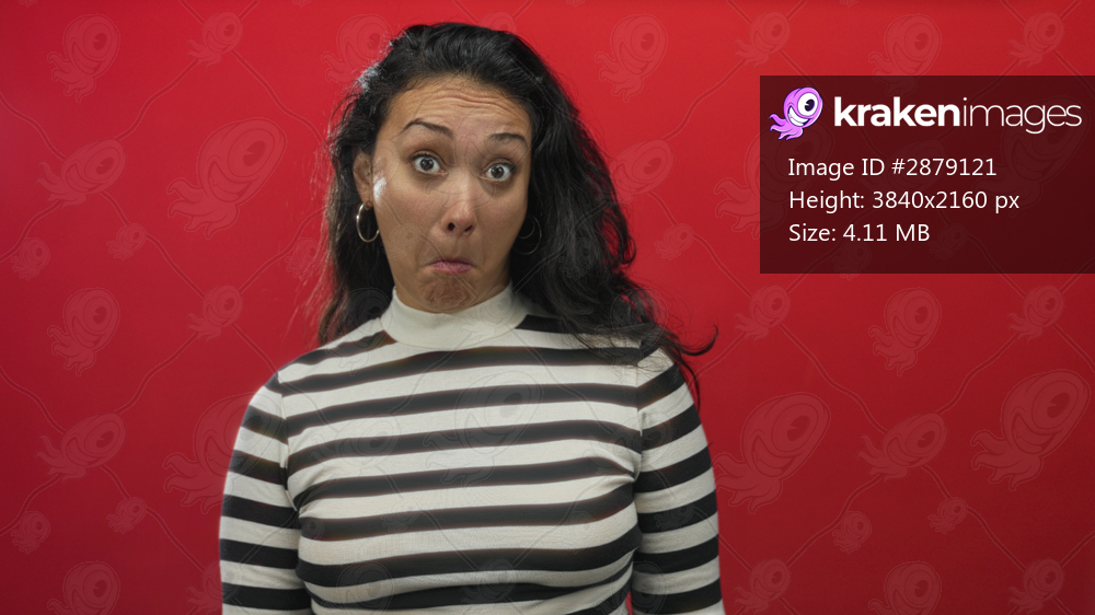 Young hispanic woman face shrugs shoulders in red studio wearing striped turtleneck and hoop earrings with hands raised in a puzzled pose; uncertainty question. - Kraken Images