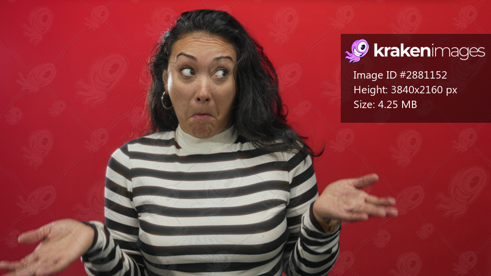 Young hispanic woman face shrugs shoulders in red studio wearing striped turtleneck and hoop earrings with hands raised in a puzzled pose; uncertainty question. - Kraken Images