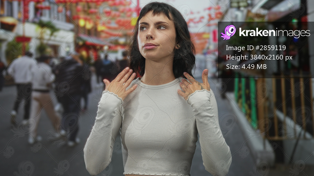 Young hispanic woman fans face with hand on busy street under hanging red lanterns in summer sunlight; relief.