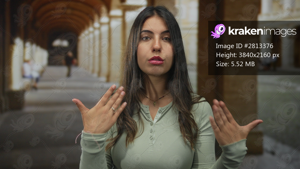 Young hispanic woman fans herself with hands under warm sunlight in a historic stone building corridor; heat discomfort.