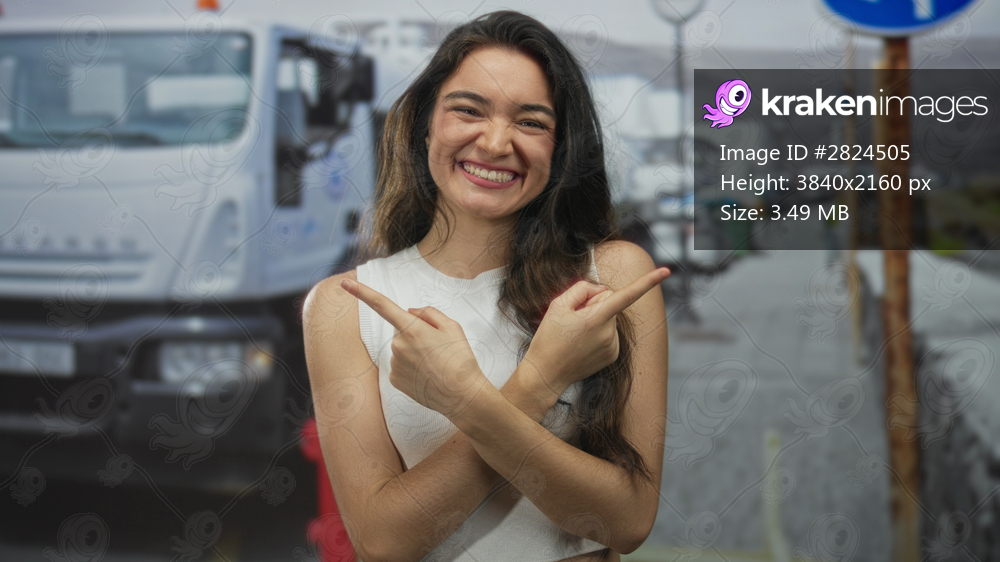 Young hispanic woman with finger pointing to object on a busy urban street sidewalk near parked truck; choice joy.