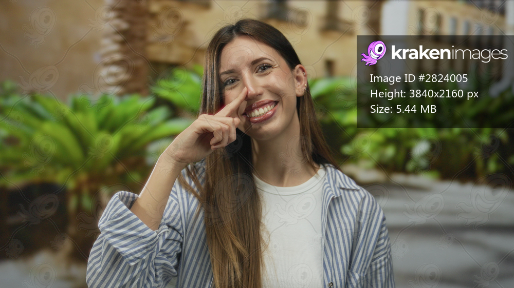 Young hispanic woman finger pointing to street corner with urban building facade under sunlight; confidence.